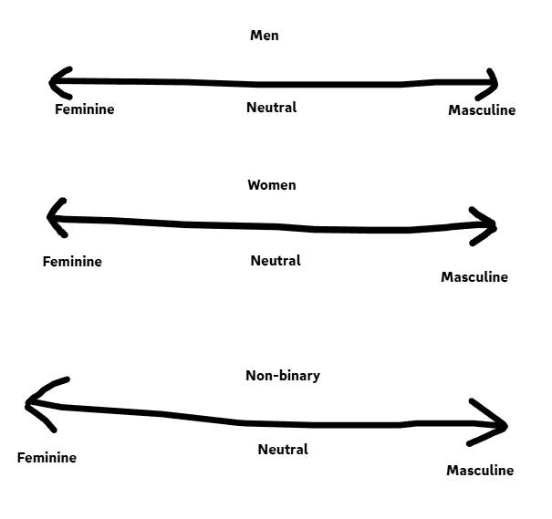 And remember because gender is a construct what masculine, feminine, non-binary mean across different cultures is going to be different. In some cultures it may be very masculine for a man to wear a skirt for instance.