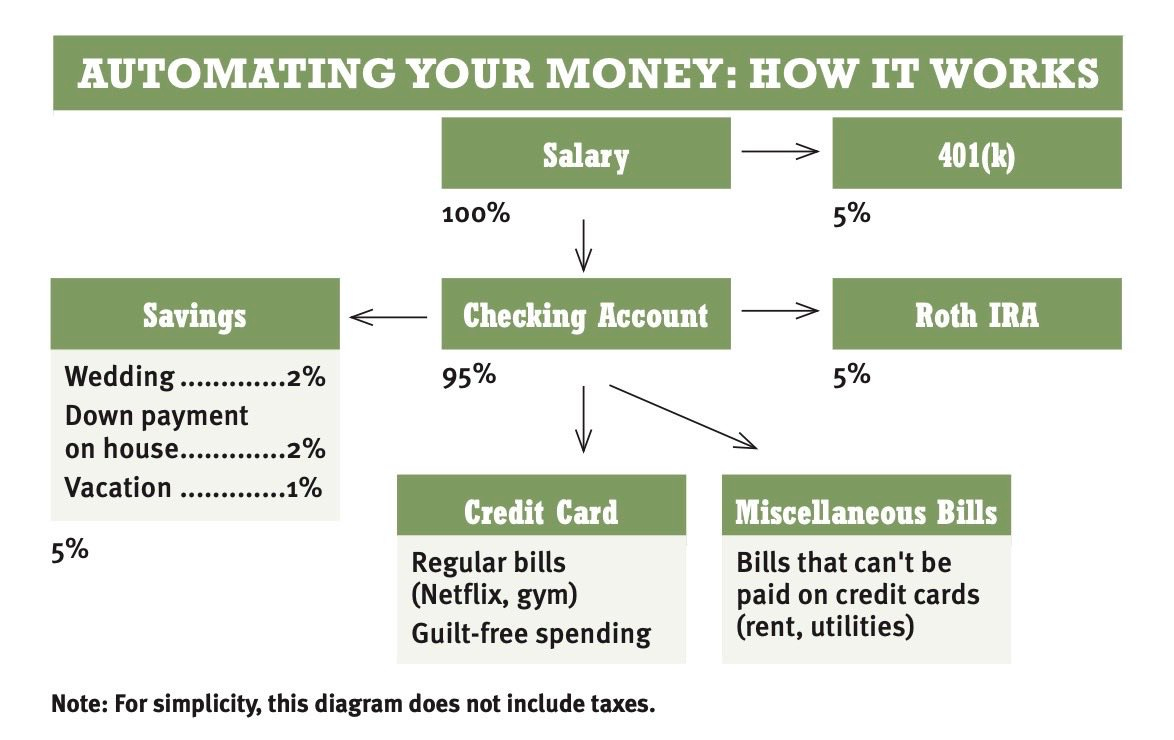 One of the biggest challenges I see with my clients is that life gets busy, and they forget to stay on top of things like saving or paying bills. Automation is your secret weapon against this. Automation takes the mental load off you, freeing you to focus on enjoying life, knowing your financial future is already in motion. Here is a diagram made by Ramit Sethi (author or I Will Teach You to Be Rich) that lays out a good model for automating your money: