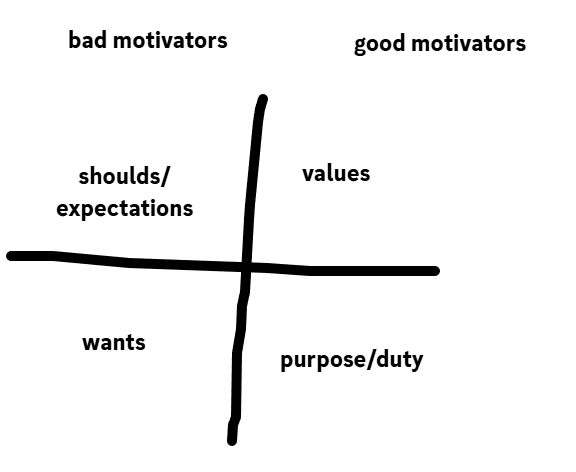 In the lower left are wants. This one confuses a lot of people because they’re like “wait shouldn’t things I want be super motivating?” The problem with wants is that they are fleeting. You smell something delicious and think to yourself “I’m going to make that when I get home!” but then you get home and you’re no longer smelling it and it would take a lot of work. You have to clean up the dishes afterward. “Eh nevermind it’s not worth it” and so you don’t follow through.