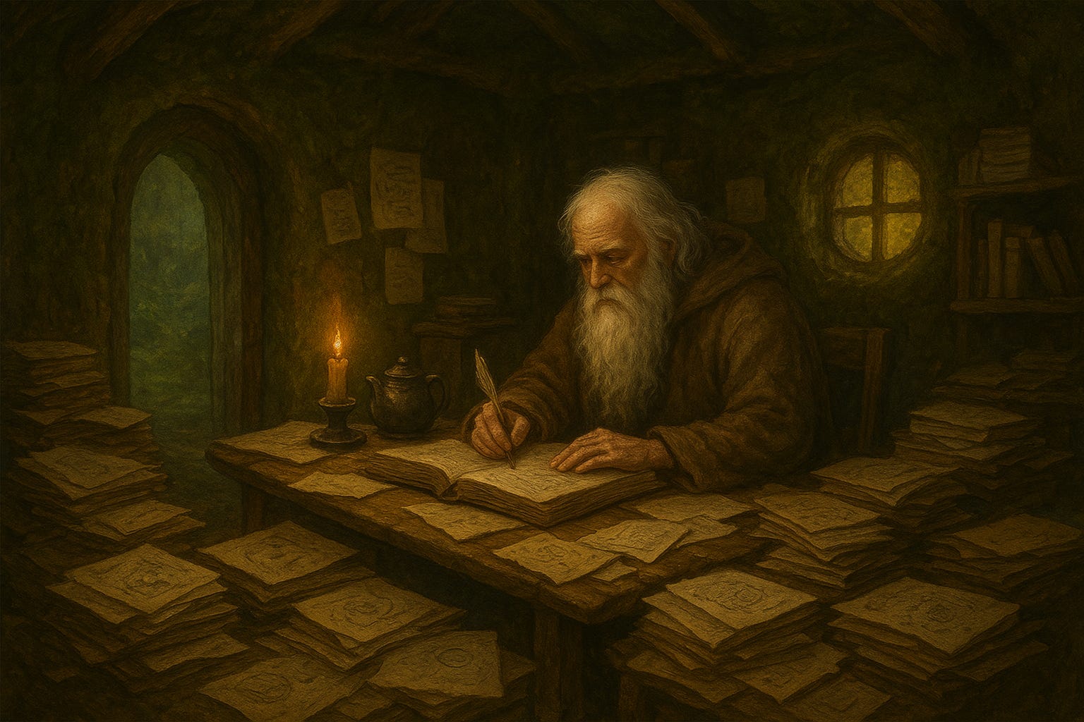 Those things feel right to me. So then I started thinking “okay how does content fit into this vision of the hermit in the hut” and what immediately came to mind was that he is constantly writing and will occasionally give something he has written to a traveler if he thinks it will help them. Maybe even sit down and discuss it with them over a cup of tea.